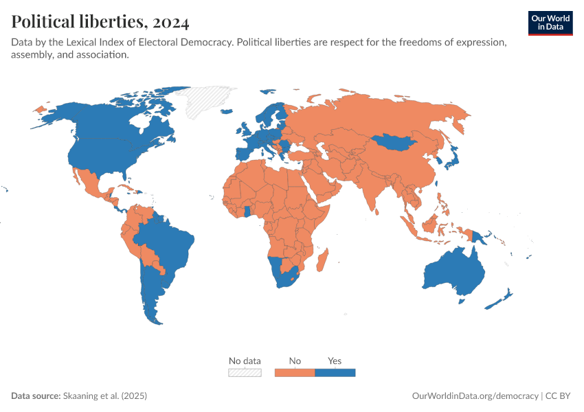 Skaaning et al. (2025) – processed by Our World in Data. “Political liberties” [dataset]. Skaaning et al., “Lexical Index of Electoral Democracy (LIED) v6.8” [original data]. Retrieved March 2, 2026 from https://data-wdi-depsupdate.owid.pages.dev:8789/20260119-065148/grapher/political-liberties-lexical.html (archived on January 19, 2026).