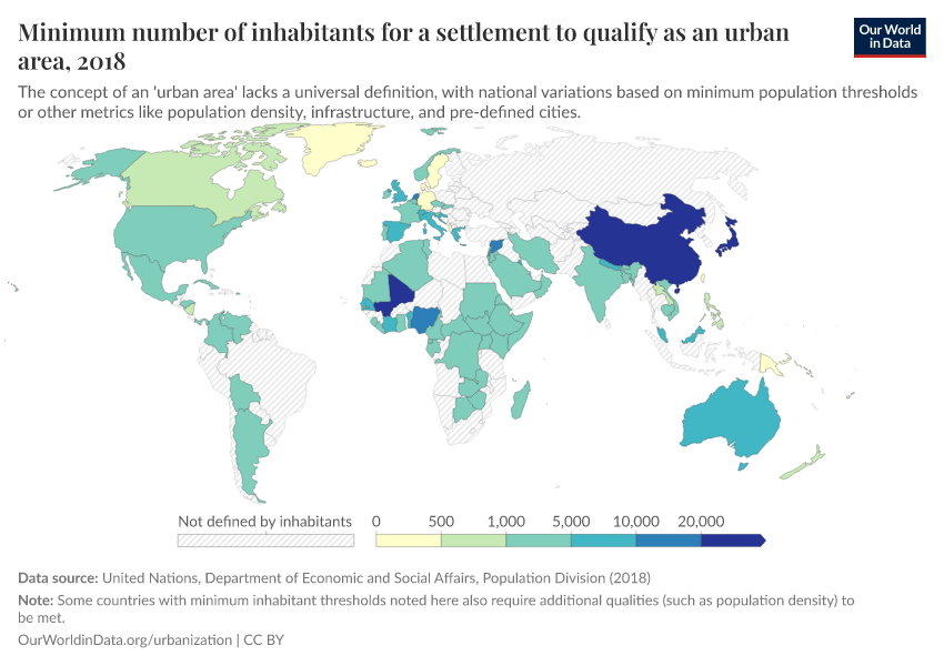 - There is no consistent definition of what constitutes an 'urban area'. This is highly variable across countries. This data presents a given country's minimum threshold of inhabitants needed for it to be defined an 'urban area'. For many countries, there is no defined threshold based on inhabitants; other metrics such as population density, infrastructure, or even pre-defined cities may be used.