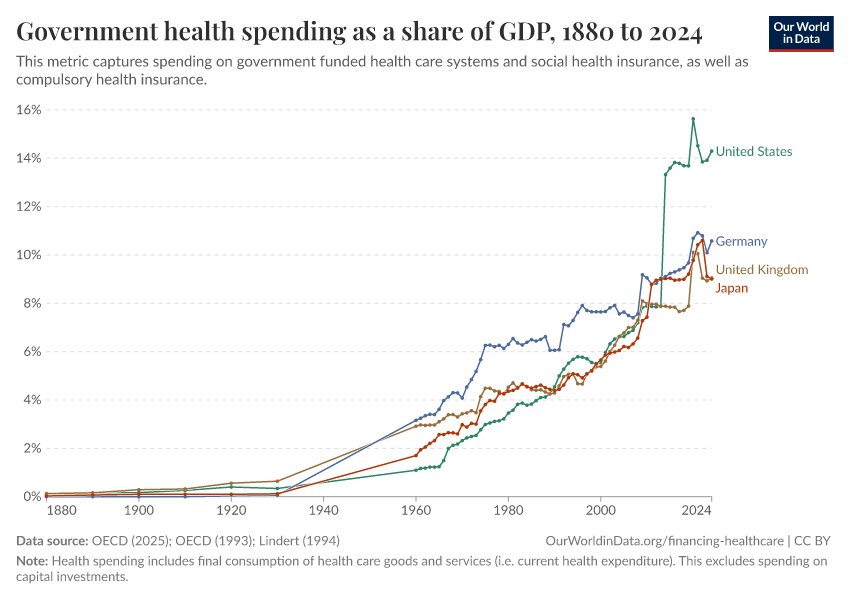 OECD (2025); OECD (1993); Lindert (1994) – with major processing by Our World in Data. “Public health expenditure as a share of GDP – Lindert, OECD – Historical data” [dataset]. OECD, “OECD Health Expenditure and Financing Database”; OECD, “OECD Health Systems”; Lindert, “The rise of social spending (1880-1930)” [original data]. Retrieved March 2, 2026 from https://data-wdi-depsupdate.owid.pages.dev:8789/20251211-191143/grapher/public-health-expenditure-share-gdp.html (archived on December 11, 2025).