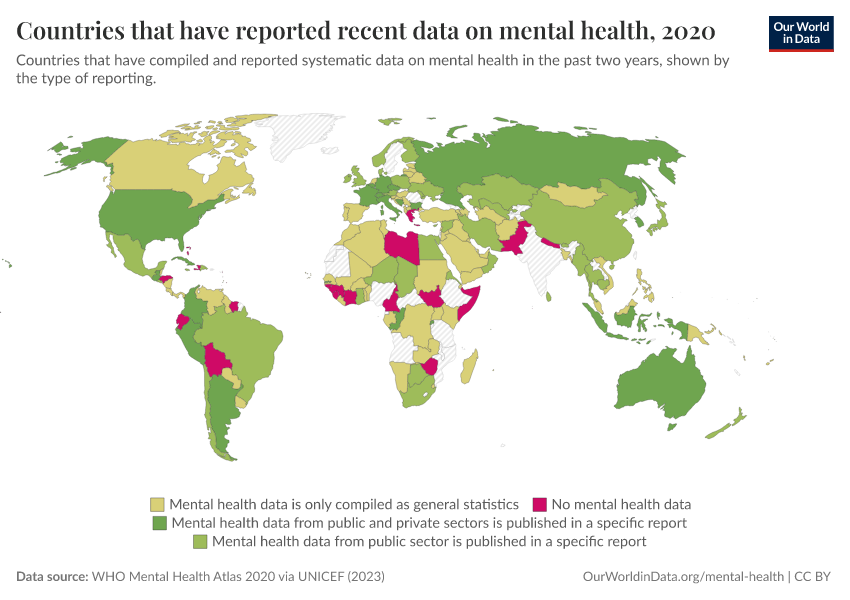 WHO Mental Health Atlas 2020 via UNICEF (2023) – with major processing by Our World in Data. “Countries that have reported recent data on mental health” [dataset]. WHO Mental Health Atlas 2020 via UNICEF, “Countdown for Global Mental Health 2030” [original data]. Retrieved March 2, 2026 from https://data-wdi-depsupdate.owid.pages.dev:8789/20260224-141219/grapher/reporting-of-mental-health-system-data-in-the-past-two-years.html (archived on February 24, 2026).