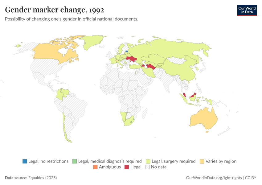 Equaldex (2025) – with major processing by Our World in Data. “Gender marker change” [dataset]. Equaldex, “Equaldex” [original data]. Retrieved March 2, 2026 from https://data-wdi-depsupdate.owid.pages.dev:8789/20250909-093708/grapher/right-to-change-legal-gender-equaldex.html (archived on September 9, 2025).