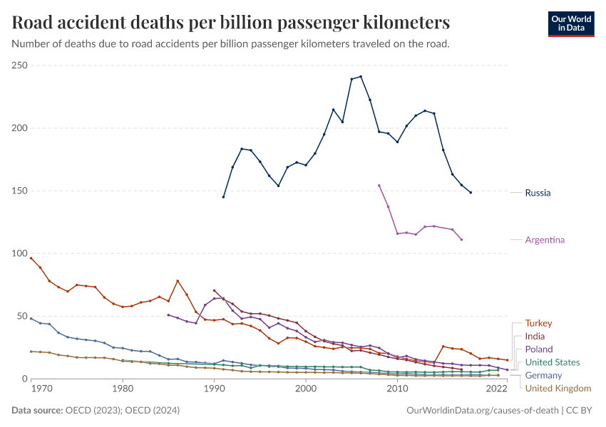 “Data Page: Road accident deaths per billion passenger kilometers”, part of the following publication: Hannah Ritchie and Max Roser (2021) - “Transport”. Data adapted from OECD. Retrieved from https://data-wdi-depsupdate.owid.pages.dev:8789/20250909-093708/grapher/road-accident-deaths-per-passenger-kilometers.html [online resource] (archived on September 9, 2025).How to cite this data