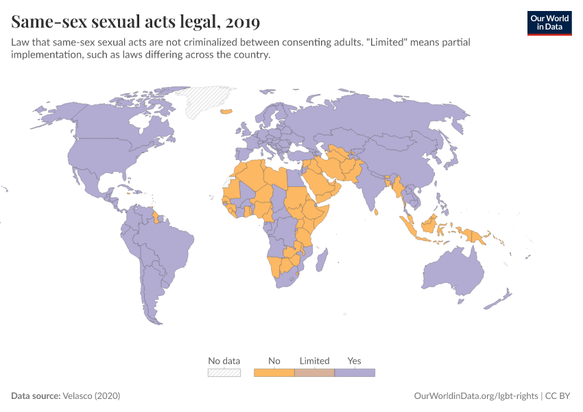 “Data Page: Same-sex sexual acts legal”, part of the following publication: Bastian Herre and Pablo Arriagada (2023) - “LGBT+ Rights”. Data adapted from Velasco. Retrieved from https://data-wdi-depsupdate.owid.pages.dev:8789/20251023-195030/grapher/same-sex-sexual-acts-legal.html [online resource] (archived on October 23, 2025).How to cite this data