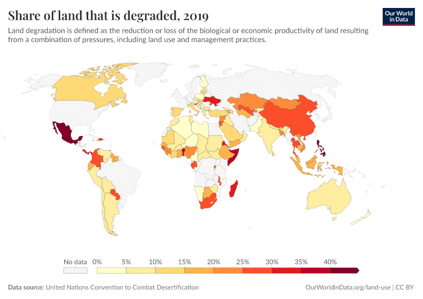 “Data Page: Share of land that is degraded”. Our World in Data (2026). Data adapted from United Nations Convention to Combat Desertification. Retrieved from https://data-wdi-depsupdate.owid.pages.dev:8789/20260130-180113/grapher/share-degraded-land.html [online resource] (archived on January 30, 2026).How to cite this data