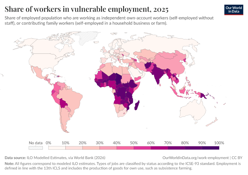 ILO Modelled Estimates, via World Bank (2026) – processed by Our World in Data. “Share of workers in vulnerable employment – ILO” [dataset]. ILO Modelled Estimates, via World Bank, “World Development Indicators 125” [original data]. Retrieved March 2, 2026 from https://data-wdi-depsupdate.owid.pages.dev:8789/20260301-083443/grapher/share-in-vulnerable-employment.html (archived on March 1, 2026).