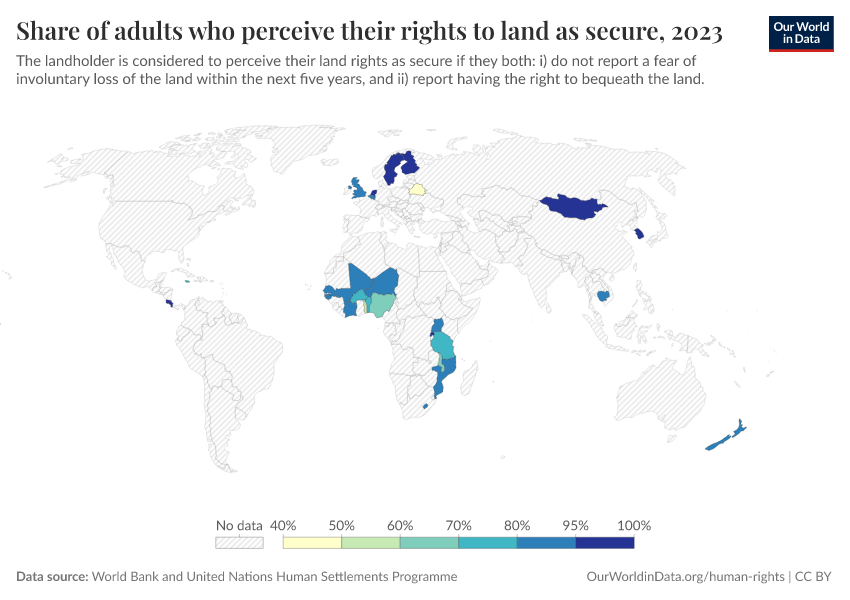 World Bank and United Nations Human Settlements Programme – processed by Our World in Data. “Share of adults who perceive their rights to land as secure” [dataset]. World Bank and United Nations Human Settlements Programme, “Data from multiple sources” [original data]. Retrieved March 2, 2026 from https://data-wdi-depsupdate.owid.pages.dev:8789/20251121-151713/grapher/share-of-adults-who-perceive-their-rights-to-land-as-secure.html (archived on November 21, 2025).