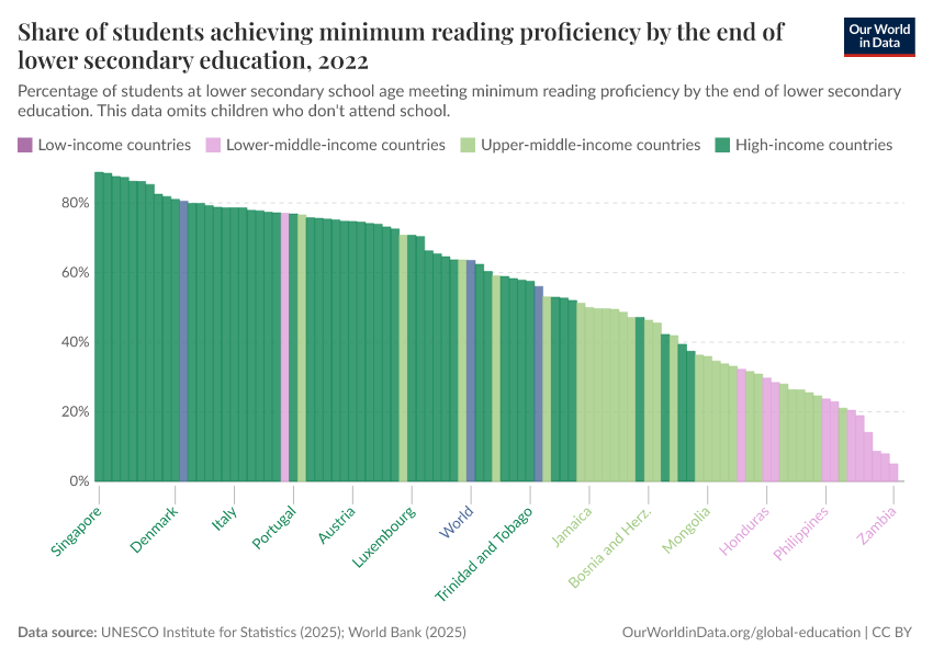 “Data Page: Share of students achieving minimum reading proficiency by the end of lower secondary education”, part of the following publication: Hannah Ritchie, Veronika Samborska, Esteban Ortiz-Ospina, and Max Roser (2023) - “Global Education”. Data adapted from UNESCO Institute for Statistics. Retrieved from https://data-wdi-depsupdate.owid.pages.dev:8789/20260122-091445/grapher/share-of-students-at-end-of-lower-secondary-education-with-minimum-reading-proficiency.html [online resource] (archived on January 22, 2026).How to cite this data