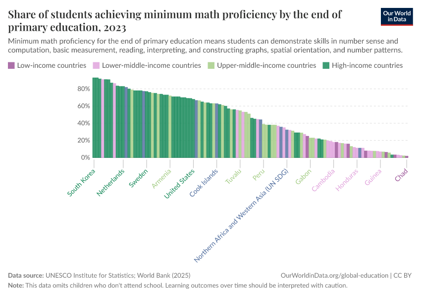 UNESCO Institute for Statistics – processed by Our World in Data. “Share of students achieving minimum math proficiency by the end of primary education” [dataset]. UNESCO Institute for Statistics, “Data from multiple sources” [original data]. Retrieved March 2, 2026 from https://data-wdi-depsupdate.owid.pages.dev:8789/20260130-180113/grapher/share-of-students-at-end-of-primary-education-achieving-minimum-math-proficiency.html (archived on January 30, 2026).