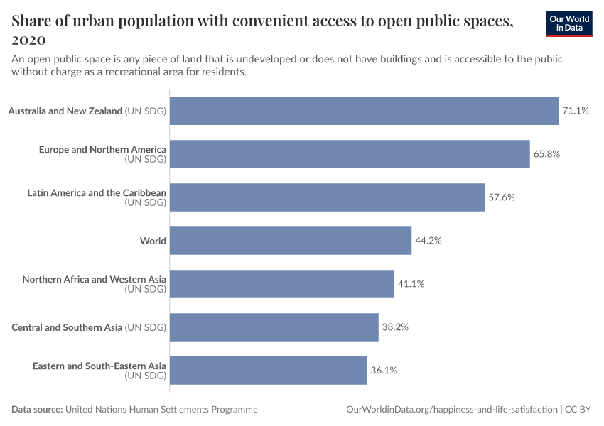 United Nations Human Settlements Programme – processed by Our World in Data. “Share of urban population with convenient access to open public spaces” [dataset]. United Nations Human Settlements Programme, “Data from multiple sources” [original data]. Retrieved March 2, 2026 from https://data-wdi-depsupdate.owid.pages.dev:8789/20260130-180113/grapher/share-of-urban-population-with-convenient-access-to-open-public-spaces.html (archived on January 30, 2026).