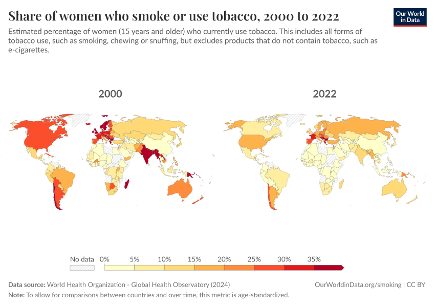 World Health Organization - Global Health Observatory (2024) – processed by Our World in Data. “Share of women who smoke or use tobacco” [dataset]. World Health Organization, “Global Health Observatory” [original data]. Retrieved March 2, 2026 from https://data-wdi-depsupdate.owid.pages.dev:8789/20260119-065148/grapher/share-of-women-who-are-smoking.html (archived on January 19, 2026).