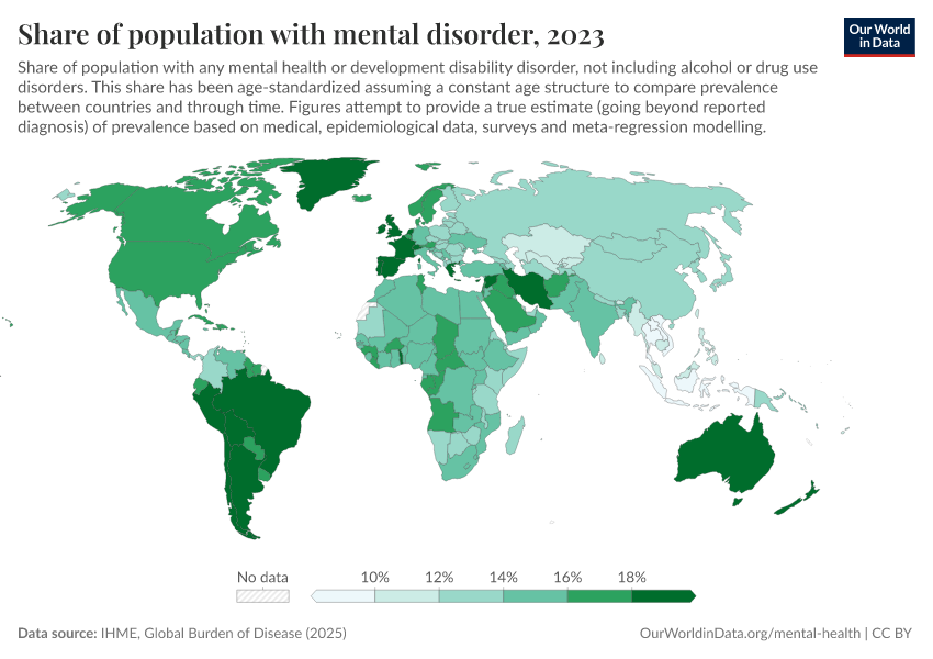 IHME, Global Burden of Disease (2025) – with major processing by Our World in Data. “Share of population with mental disorder” [dataset]. IHME, Global Burden of Disease, “Global Burden of Disease - Mental Health Prevalence” [original data]. Retrieved March 2, 2026 from https://data-wdi-depsupdate.owid.pages.dev:8789/20260212-100858/grapher/share-with-mental-health-or-development-disorder.html (archived on February 12, 2026).