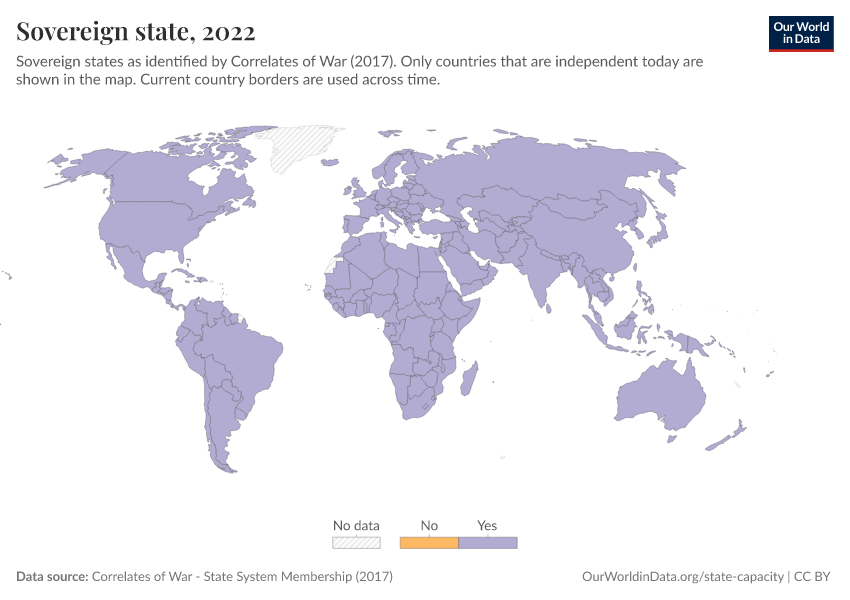 “Data Page: Sovereign state”, part of the following publication: Bastian Herre and Pablo Arriagada (2023) - “State Capacity”. Data adapted from Correlates of War. Retrieved from https://data-wdi-depsupdate.owid.pages.dev:8789/20260301-071607/grapher/sovereign-state-cow.html [online resource] (archived on March 1, 2026).How to cite this data