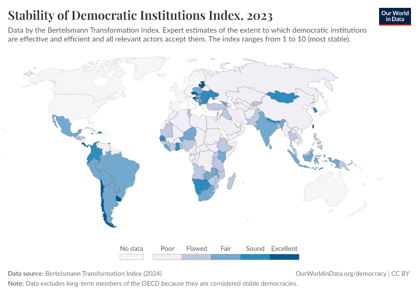 Bertelsmann Transformation Index (2024) – processed by Our World in Data. “Stability of Democratic Institutions Index” [dataset]. Bertelsmann Transformation Index, “Bertelsmann Transformation Index, Scores” [original data]. Retrieved March 2, 2026 from https://data-wdi-depsupdate.owid.pages.dev:8789/20260105-133053/grapher/stability-democratic-institutions-index-bti.html (archived on January 5, 2026).