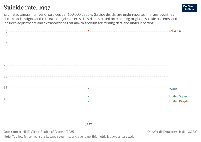 IHME, Global Burden of Disease (2025) – with major processing by Our World in Data. “Suicide rate” [dataset]. IHME, Global Burden of Disease, “Global Burden of Disease - Deaths” [original data]. Retrieved March 2, 2026 from https://data-wdi-depsupdate.owid.pages.dev:8789/20260211-173942/grapher/suicide-death-rates.html (archived on February 11, 2026).