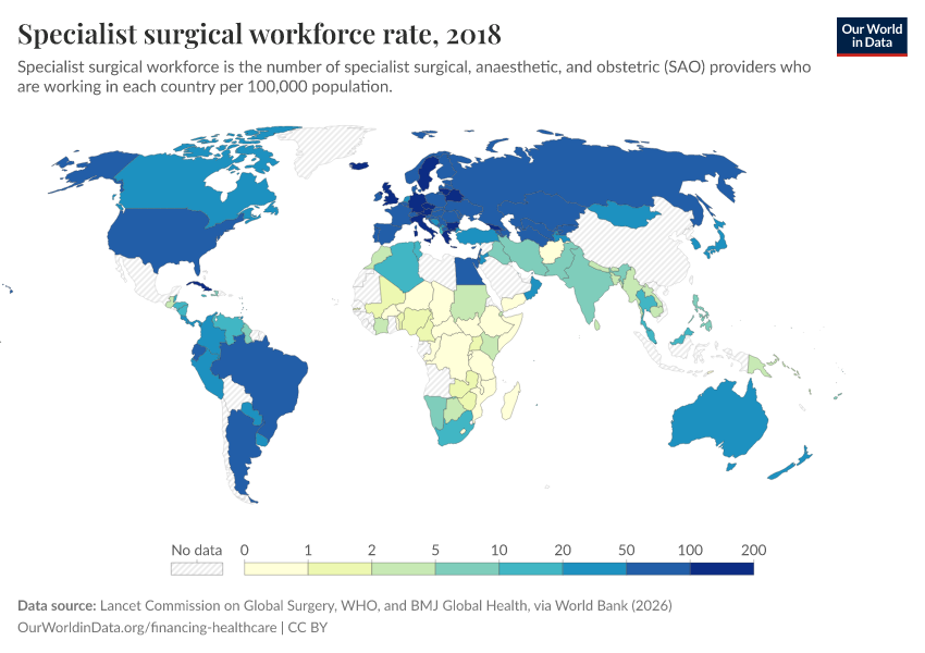 “Data Page: Specialist surgical workforce rate”. Our World in Data (2026). Data adapted from Lancet Commission on Global Surgery, WHO, and BMJ Global Health, via World Bank. Retrieved from https://data-wdi-depsupdate.owid.pages.dev:8789/20260301-083443/grapher/surgeons-per-100000.html [online resource] (archived on March 1, 2026).How to cite this data