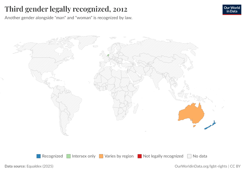 “Data Page: Third gender legally recognized”, part of the following publication: Bastian Herre and Pablo Arriagada (2023) - “LGBT+ Rights”. Data adapted from Equaldex. Retrieved from https://data-wdi-depsupdate.owid.pages.dev:8789/20250909-093708/grapher/third-gender-recognition-equaldex.html [online resource] (archived on September 9, 2025).