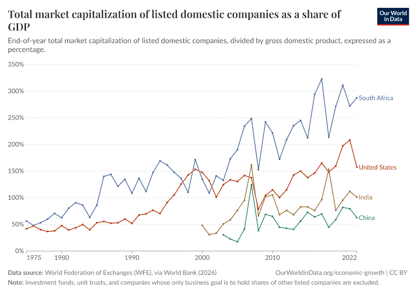 “Data Page: Total market capitalization of listed domestic companies as a share of GDP”. Our World in Data (2026). Data adapted from World Federation of Exchanges (WFE), via World Bank. Retrieved from https://data-wdi-depsupdate.owid.pages.dev:8789/20260301-083443/grapher/total-market-capitalization-listed-domestic-companies-share-gdp.html [online resource] (archived on March 1, 2026).How to cite this data
