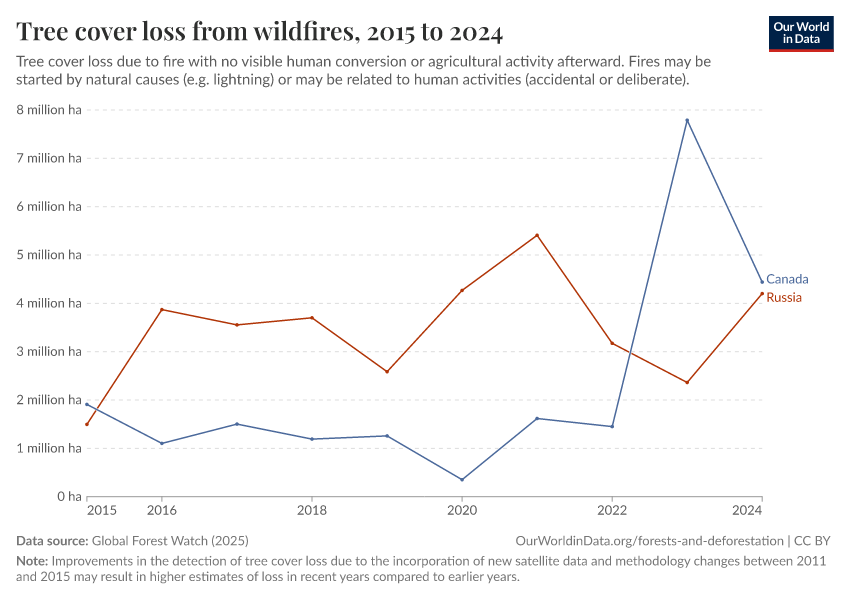 Global Forest Watch (2025) – with major processing by Our World in Data. “Tree cover loss from wildfires” [dataset]. Global Forest Watch, “Tree Cover Loss by Dominant Driver” [original data]. Retrieved March 2, 2026 from https://data-wdi-depsupdate.owid.pages.dev:8789/20260119-065148/grapher/tree-cover-loss-from-wildfires.html (archived on January 19, 2026).