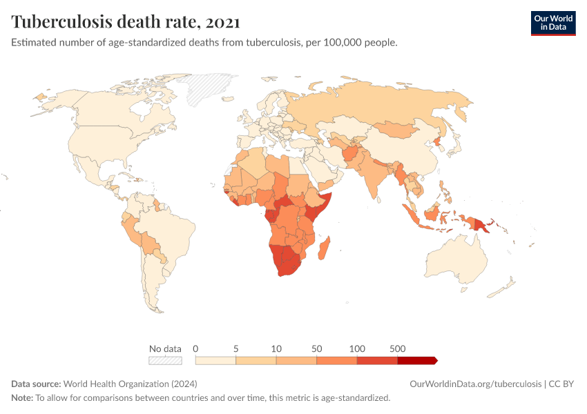 World Health Organization (2024) – with major processing by Our World in Data. “Tuberculosis death rate” [dataset]. World Health Organization, “Global Health Estimates” [original data]. Retrieved March 2, 2026 from https://data-wdi-depsupdate.owid.pages.dev:8789/20250909-093708/grapher/tuberculosis-death-rate-age-standardized.html (archived on September 9, 2025).