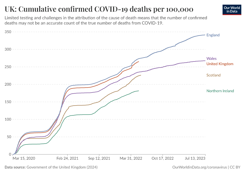 Government of the United Kingdom (2024) – with minor processing by Our World in Data. “UK: Cumulative confirmed COVID-19 deaths per 100,000” [dataset]. Government of the United Kingdom, “UKHSA data dashboard” [original data]. Retrieved March 2, 2026 from https://data-wdi-depsupdate.owid.pages.dev:8789/20250909-093708/grapher/uk-cumulative-covid-deaths-rate.html (archived on September 9, 2025).