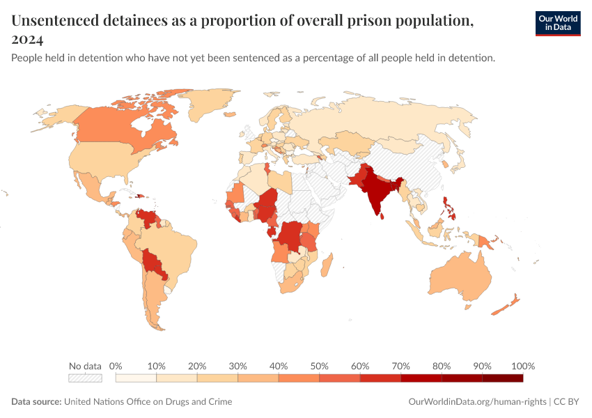 “Data Page: Unsentenced detainees as a proportion of overall prison population”. Our World in Data (2026). Data adapted from United Nations Office on Drugs and Crime. Retrieved from https://data-wdi-depsupdate.owid.pages.dev:8789/20260130-180113/grapher/unsentenced-detainees-as-proportion-of-prison-population.html [online resource] (archived on January 30, 2026).How to cite this data