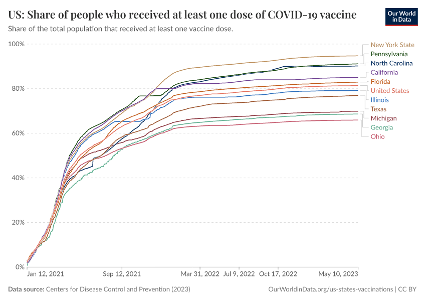 Centers for Disease Control and Prevention (2023) – processed by Our World in Data. “US: Share of people who received at least one dose of COVID-19 vaccine” [dataset]. Centers for Disease Control and Prevention, “COVID-19, Vaccinations (United States)” [original data]. Retrieved March 2, 2026 from https://data-wdi-depsupdate.owid.pages.dev:8789/20250909-093708/grapher/us-covid-19-share-people-vaccinated.html (archived on September 9, 2025).