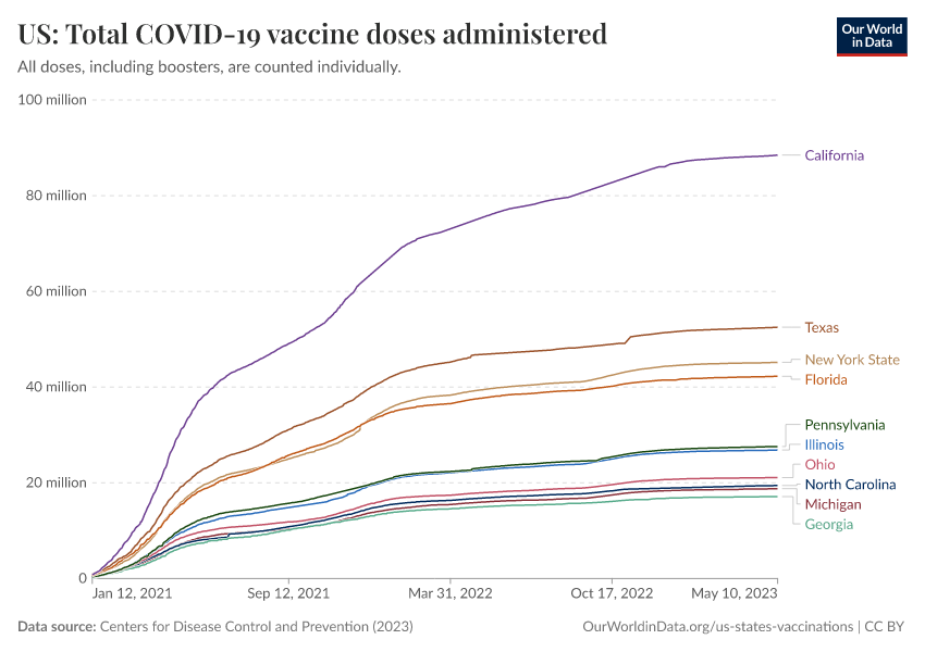 Centers for Disease Control and Prevention (2023) – processed by Our World in Data. “US: Total COVID-19 vaccine doses administered” [dataset]. Centers for Disease Control and Prevention, “COVID-19, Vaccinations (United States)” [original data]. Retrieved March 2, 2026 from https://data-wdi-depsupdate.owid.pages.dev:8789/20250909-093708/grapher/us-total-covid-19-vaccine-doses-administered.html (archived on September 9, 2025).