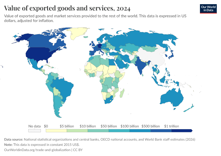 “Data Page: Value of exported goods and services”. Our World in Data (2026). Data adapted from National statistical organizations and central banks, OECD national accounts, and World Bank staff estimates. Retrieved from https://data-wdi-depsupdate.owid.pages.dev:8789/20260301-083443/grapher/value-of-exported-goods-and-services.html [online resource] (archived on March 1, 2026).How to cite this data