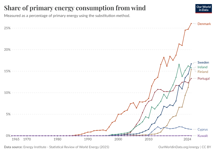 Energy Institute - Statistical Review of World Energy (2025) – with major processing by Our World in Data. “Share of primary energy consumption that comes from wind power – Using the substitution method” [dataset]. Energy Institute, “Statistical Review of World Energy” [original data]. Retrieved March 2, 2026 from https://data-wdi-depsupdate.owid.pages.dev:8789/20260119-070102/grapher/wind-share-energy.html (archived on January 19, 2026).