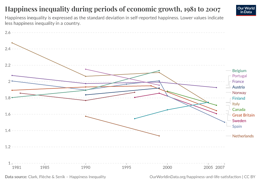 The results from Stevenson and Wolfers are consistent with other studies looking at changes of happiness inequality (or life satisfaction inequality) over time. In particular, researchers have noted that there is a correlation between economic growth and reductions in happiness inequality—even when income inequality is increasing at the same time. The visualization here uses data from Clark, Fleche, and Senik (2015)6 shows this. It plots the evolution of happiness inequality within a selection of rich countries that experienced uninterrupted GDP growth.