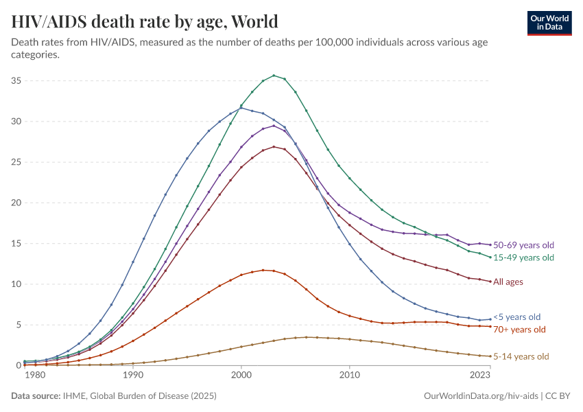 Max Roser and Hannah Ritchie (2023) - “HIV / AIDS” Published online at OurWorldinData.org. Retrieved from: 'https://data-wdi-depsupdate.owid.pages.dev/hiv-aids' [Online Resource]BibTeX citation