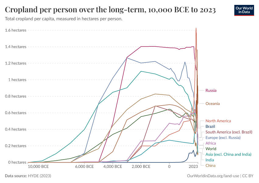 The visualization here shows the change in the average cropland use per person over the long term (since 10,000 BCE), measured in hectares per person.