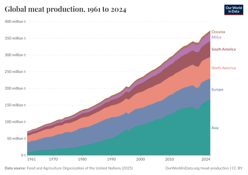 Meat is an important source of nutrition for many people around the world. Global demand for meat is growing: over the past 50 years, meat production has more than tripled. The world now produces more than 350 million tonnes each year.