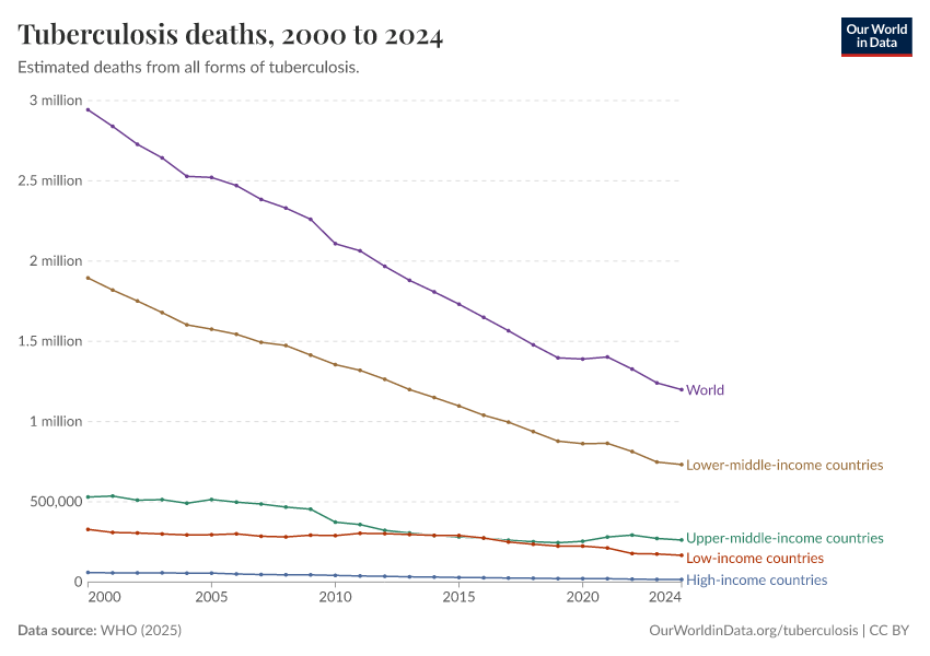 Hannah Ritchie and Fiona Spooner (2025) - “The end of tuberculosis that wasn’t” Published online at OurWorldinData.org. Retrieved from: 'https://data-wdi-depsupdate.owid.pages.dev:8789/20260211-174736/the-end-of-tuberculosis-that-wasnt.html' [Online Resource] (archived on February 11, 2026).BibTeX citation