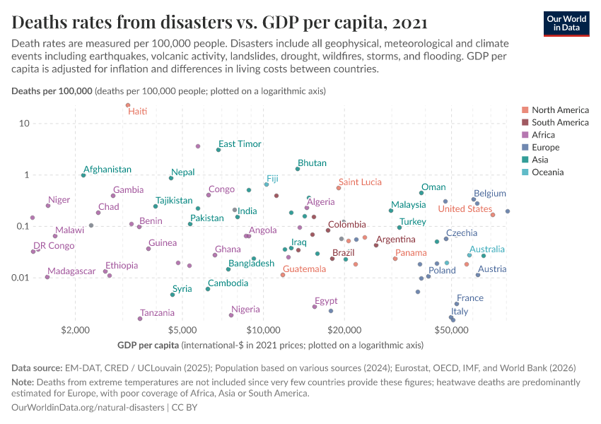 Hannah Ritchie (2024) - “The world has become more resilient to disasters, but investment is needed to save more lives” Published online at OurWorldinData.org. Retrieved from: 'https://data-wdi-depsupdate.owid.pages.dev:8789/20260301-083443/the-world-has-become-more-resilient-to-disasters-but-investment-is-needed-to-save-more-lives.html' [Online Resource] (archived on March 1, 2026).BibTeX citation
