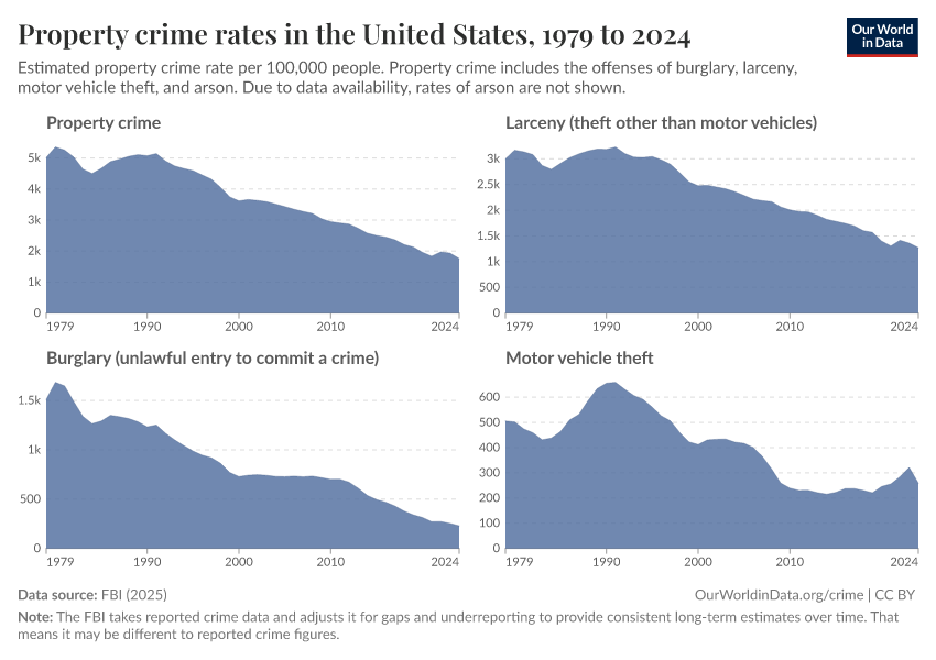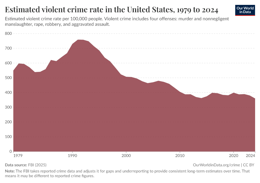 Hannah Ritchie and Fiona Spooner (2026) - “How have crime rates in the United States changed over the last 50 years?” Published online at OurWorldinData.org. Retrieved from: 'https://data-wdi-depsupdate.owid.pages.dev:8789/20260119-000134/us-crime-rates.html' [Online Resource] (archived on January 19, 2026).BibTeX citation