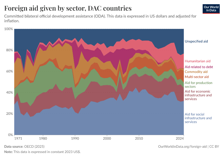Thanks to these consistent reporting standards, we see clear patterns. For example, DAC countries, on the whole, have allocated approximately a third of their aid budgets to social infrastructure and services since 2000. This category focuses on developing the human resource potential of developing countries and includes areas like education, healthcare, and access to clean water and sanitation.